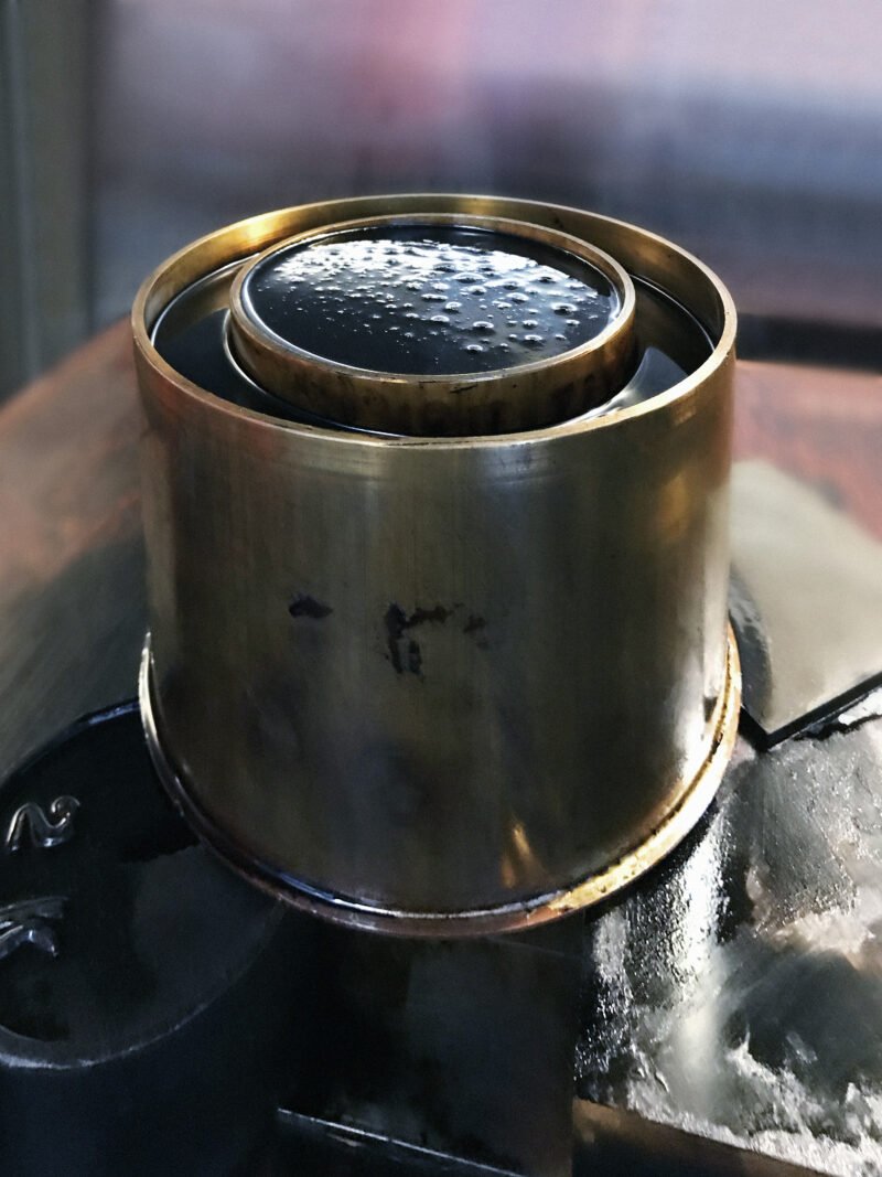 The setup: the complexity of Viscosity broken down to simplest elements starts with a cylinder serving as a reservoir for the oil sample placed in an environment chamber. Three meshes act as electrodes connected to a low amperage, high voltage power supply. The crude oil flows through the electrodes into a capillary tube with a beaker collecting the oil below.